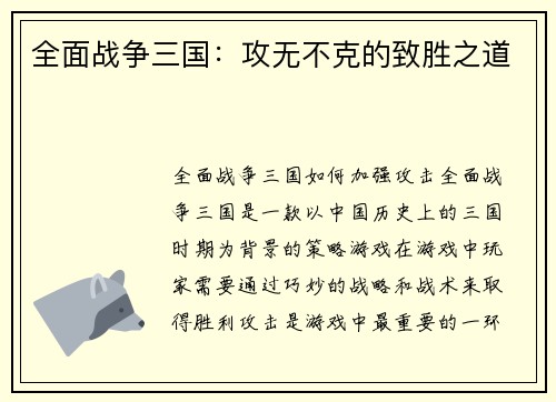 全面战争三国如何加强攻击 全面战争三国是一款以中国历史上的三国时期为背景的策略游戏。在游戏中,玩家需要通过巧妙的战略和战术来取得胜利。攻击是游戏中最重要的一环,本文将从多个方面介绍如何加强攻击,帮助玩...