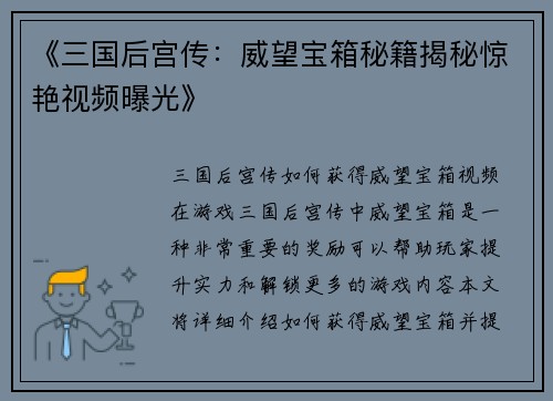 《三国后宫传:威望宝箱秘籍揭秘惊艳视频曝光》