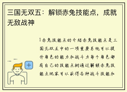 解锁赤兔技能点是《三国无双五》中提升战斗力的重要途径。通过选择合适的技能点、解锁顺序、提升等级等方式,玩家可以不断提升角色的能力和战斗力,以在游戏中取得更好的成绩。多样化的技能点组合和战略选择也能带来更丰富的游戏体验。希望本文对玩家解锁赤兔技能点有所帮助,祝愿玩家在游戏中取得好成绩!